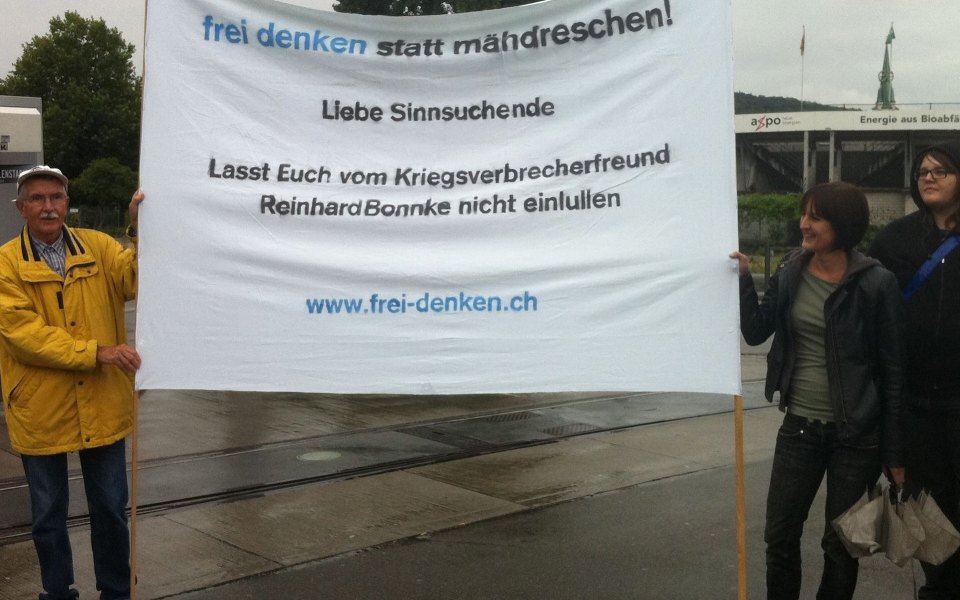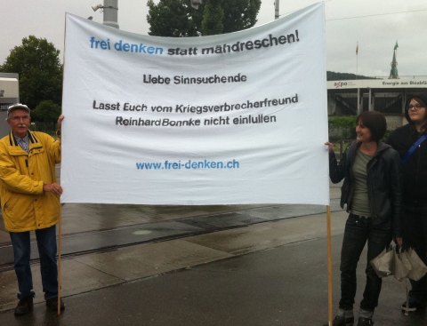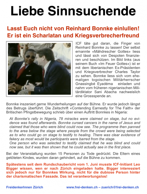 Von diesen pikanten Details zu Bonnke ist auf den ICF-Seiten natürlich nichts zu lesen. Die Zürcher FreidenkerInnen begrüssten die Sinnsuchenden deshalb mit einem Transparent und verteilten einen Informationsflyer. Nicht wenige erwiderten erbost oder mit Bekehrungsversuchen. Doch etliche gaben zu, dass sie Bonnke mit gemischten Gefühlen erwarteten.